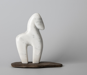 2022Aiyanar paardje gemaakt van wit carrara marmer op zwarte kei sokkel.